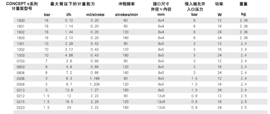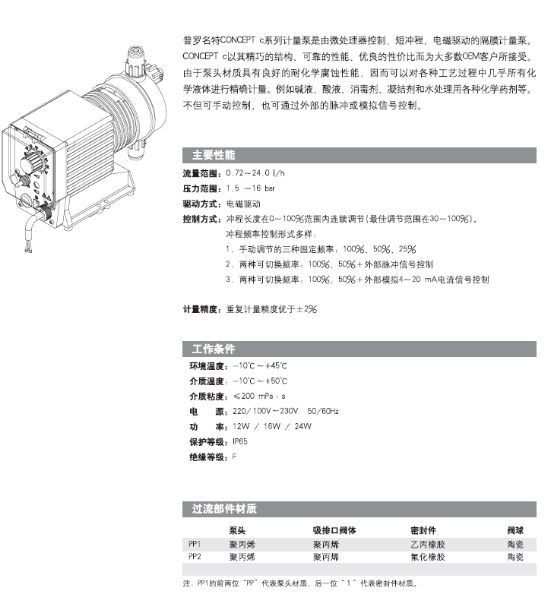 计量范围:0.72-24 l/h, 16-1.5 bar 由微处理器控制,短冲程、电磁驱动的隔膜型计量泵。CONCEPT c系列计量泵以其精巧的结构、可靠的性能、优越的性价比而为大多数OEM客户所接受。由于泵头材质具有良好的耐化学腐蚀性能,因而可以对各种工艺过程中几乎所有化学液体进行精确计量。不但可手动控制,也可通过外部的脉冲或模拟信号控制。