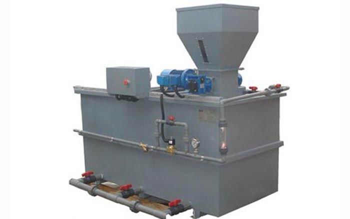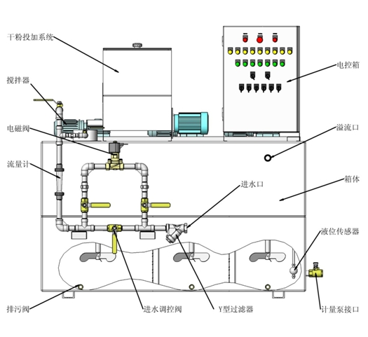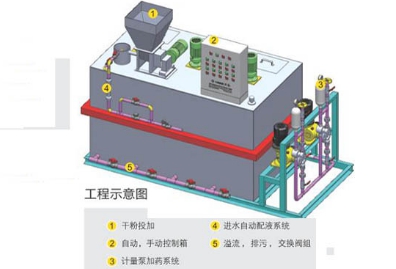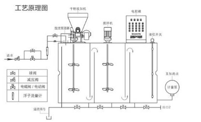 聚合物溶液制备过程是通过各个溶液箱分级逐步处理完成的.溶液箱之间隔开。保证每个溶液箱内的最佳反应时间和恒定的浓度.避免在预制箱和最终溶液箱之间产生任何直接通路。该设备由控制箱自动控制.此控制箱与安装在最终溶液箱上的液位计相连.一旦液位达到“低位”,触发电动进水阀打开。触点式流量计就启动干投机.干投量的大小按照水量而定,以获取精确的浓度,一旦达到“高位”此循环过程就停止。当然两(或三个)揽拌器还在工作。该设备还用于将乳胶状的阳离子、阴离子或无离子型的聚合物连续自动的制成标准稀释浓度(0.3-5g/L)的溶液。尽管一般认为乳胶状的聚合物制成标准溶液所需的熟化时间大大少于粉粒状聚合物,但是在将药耗达到最佳状态过程中总是推荐要充分的熟化时间。