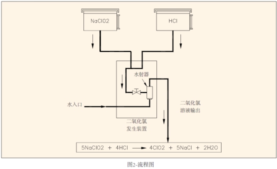 ♦ 全液相系统:采用32%的盐酸以及25%的亚氯酸钠作为原料,生成二氧化氯,生产过程中无氯气产生。